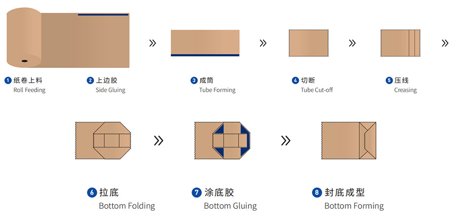 该机器用于生产以纸张为原料的环保纸袋,食品纸袋,购物纸袋,各品种的手提纸袋,该机是将原色纸或印刷好的卷筒纸经本机一次性完成制袋,将纸张进行涂边胶、成筒、切断、压痕、底部涂胶、袋底成形并输送出袋,整个过程一次性同步完成。真正实现了全自动化生产,能够有效地节省人工成本。