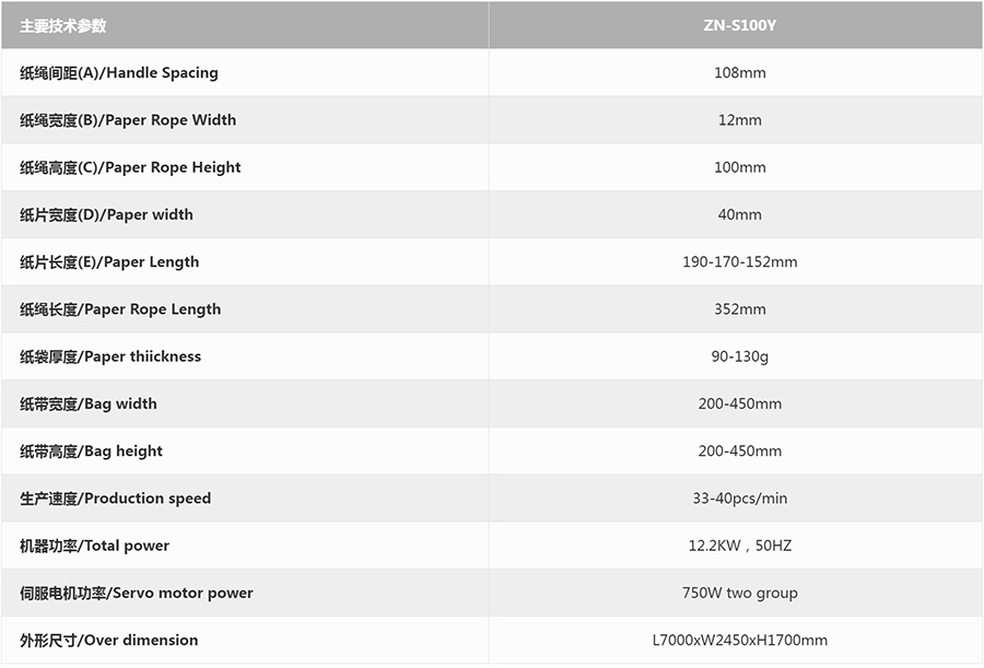 该机器用于生产带手挽加舌口的手提纸袋,由手挽工位将制好的圆绳和卷筒纸片自动做成手挽。通过输送系统将做好的手挽传送给切把、送把贴把、压把的工位,然后将原色或印刷好的卷筒纸进行舌口的开窗吸废、涂胶贴纸、易撕线预刺、舌口位预刺、贴片避绳位点断、贴片位涂胶、自动粘贴手挽,再由主机将贴有手挽的纸张进行涂边胶、成筒、拉断、切断、压痕、底部涂胶、袋底成形并输送出袋,整个过程一次性同步完成。真正实现了全自动化生产,能够有效地节省人工成本。