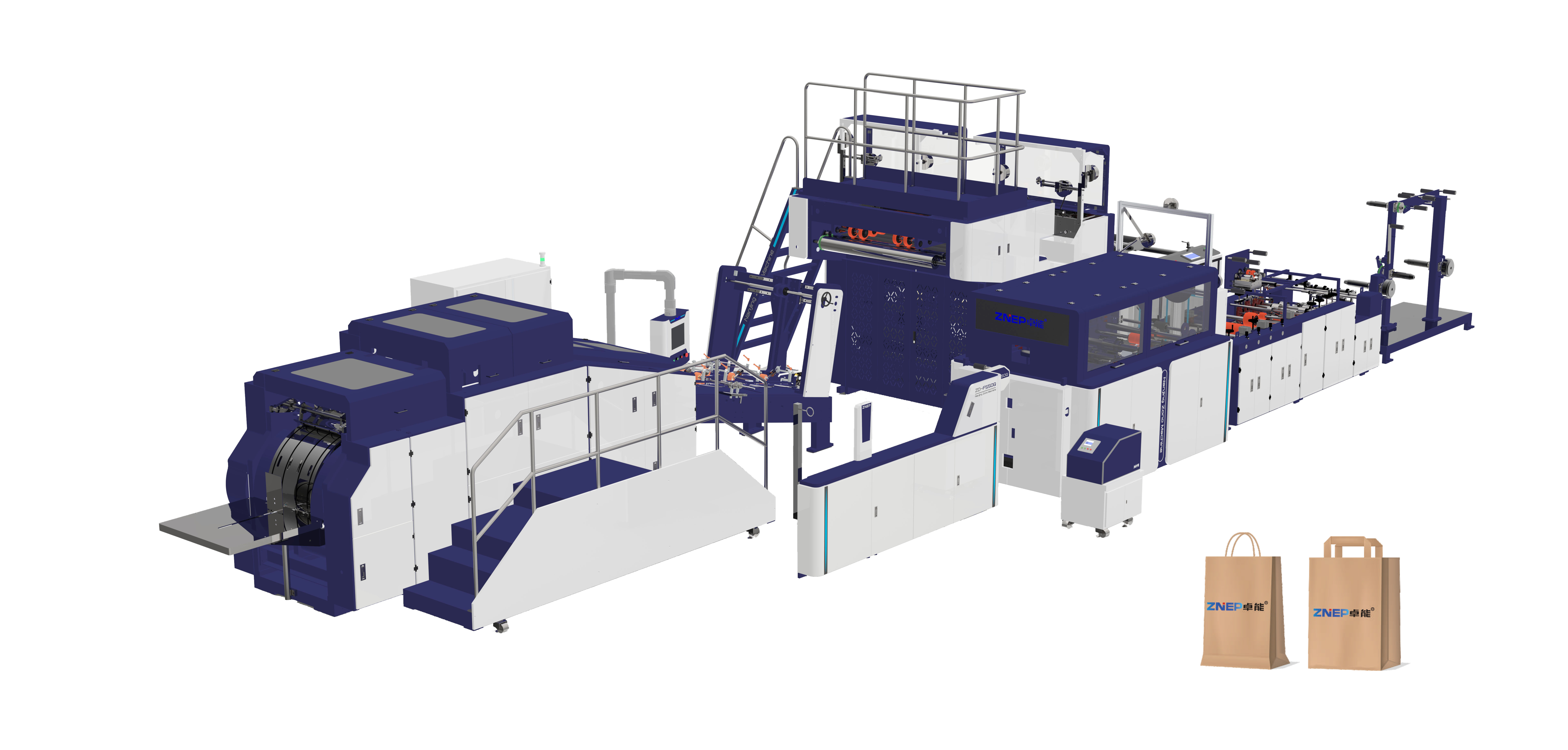 该机器用于生产带手挽的手提纸袋,由手挽工位将原材料自动做成手挽,通过输送系统将做好的手挽传送给切把、送把、贴把、压把的工位,然后将原色或印刷好的卷筒纸进行贴片位点断、贴片位涂胶、自动粘贴手挽,再由主机将贴有手挽的纸张进行涂边胶、成筒、切断、压痕、底部涂胶、袋底成形并输送出袋,整个过程一次性同步完成。真正实现了全自动化生产,能够有效地节省人工成本。