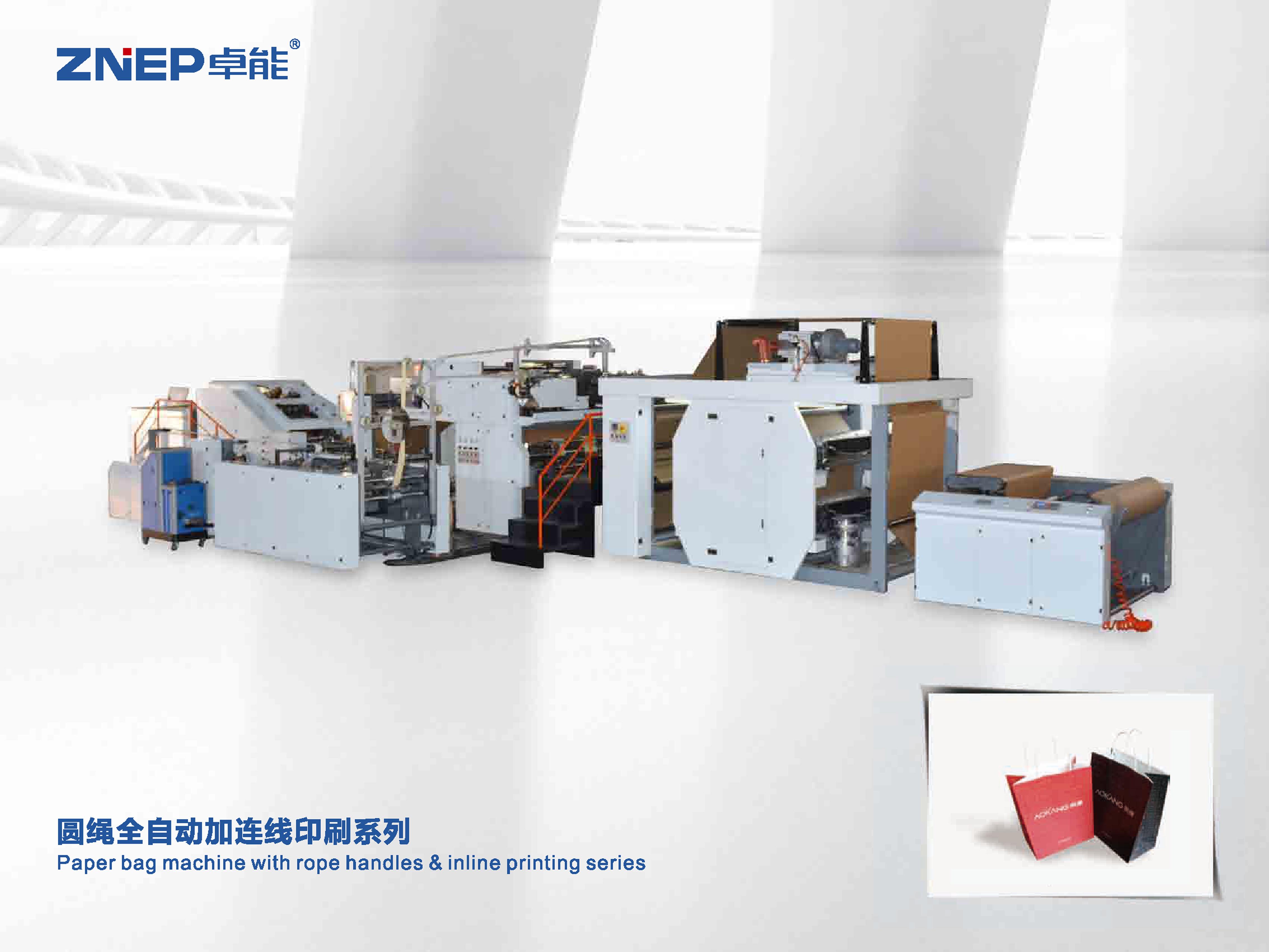 该机器用于生产带手挽的手提纸袋,并配有4色同步印刷,由手挽机将卷绳和贴片卷筒纸制成手挽,通过输送系统将手挽送至贴把机组然后将原色或印刷好的卷筒纸进行贴片位点断、贴片位涂胶、自动粘贴手挽,再由主机将贴有手挽的纸张进行涂边胶、成筒、切断、压痕、底部涂胶、袋底成形并输送出袋,整个过程一次性同步完成。此设备真正实现了全自动化生产,能够有效地节省人工成本。