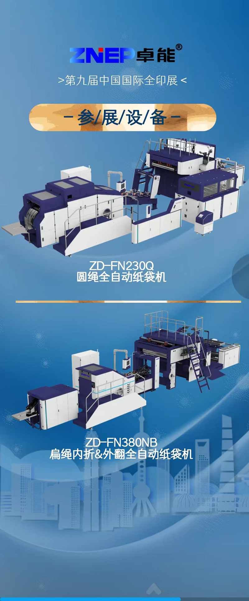 第九届中国国际(上海)全印展,展会时间2023年11月1日至4日,荣耀体育app官方在线入口展位号N3B419位置。届时将向广大客户展示最新纸袋机设备及相关技术。卷筒内折圆/扁绳全自动纸袋机,卷筒舌口全自动纸袋机,圆绳全自动纸袋机,扁绳内折/外翻全自动纸袋机。